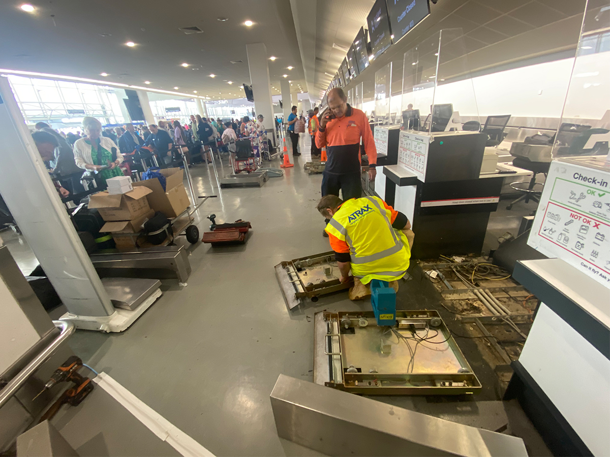 “When we got the initial call, only a few battery powered self-check scales were estimated to be affected,” Kevin says, “but my engineering manager quickly realised that this would be a much bigger problem than first thought. He put other service providers on notice and, once the flood water was pumped out, went to the airport to conduct an onsite assessment of the damaged equipment, and let them know that ALL the scales would be affected.” Atrax mobilised accordingly.